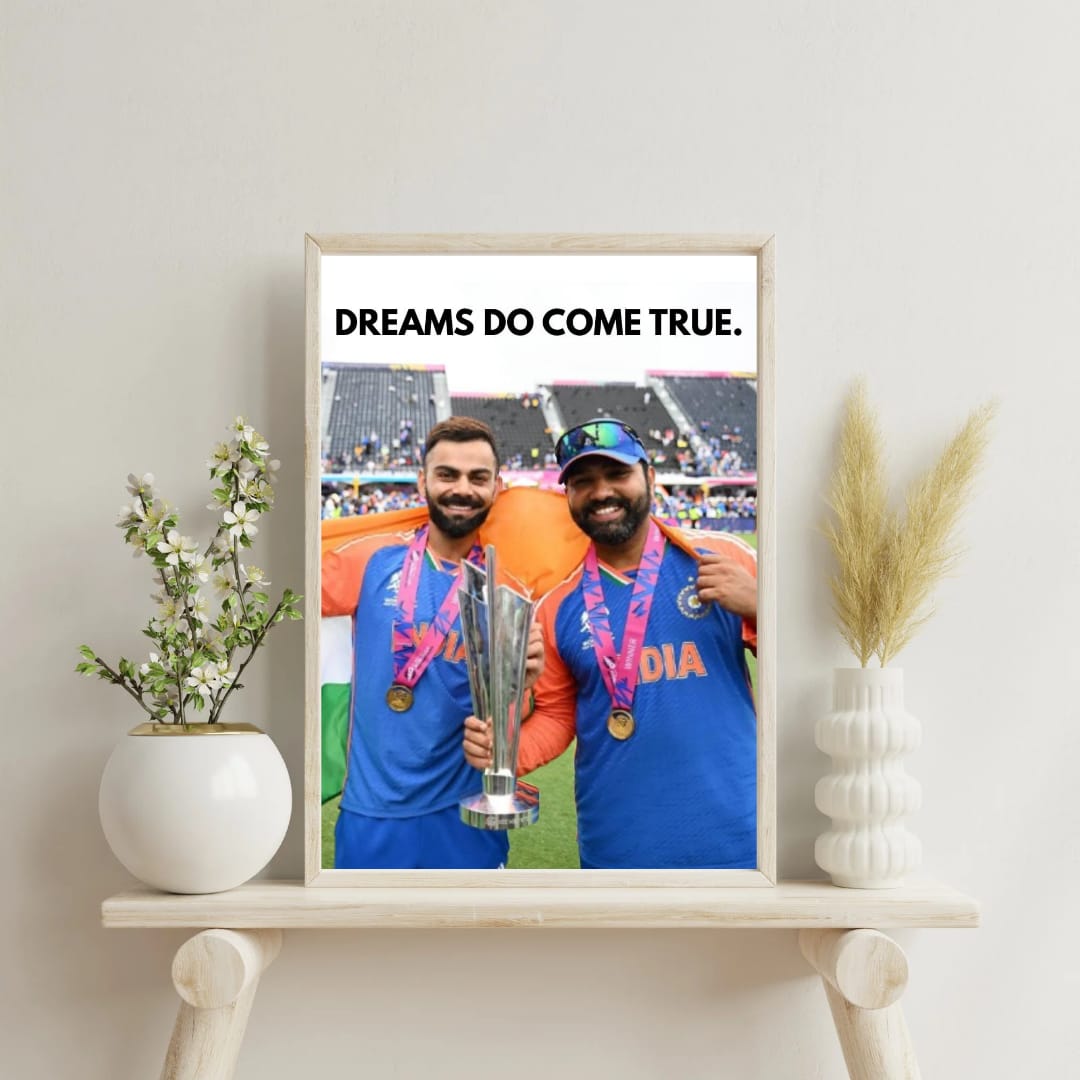 Celebrate cricket history with this iconic T20 World Cup photo poster featuring Rohit Sharma and Virat Kohli. Perfect for enthusiasts and collectors, this high-quality print captures a memorable moment of teamwork and triumph, adding a touch of sporting excellence to your space. Ideal for framing and gifting to fans who appreciate the spirit of the game.
