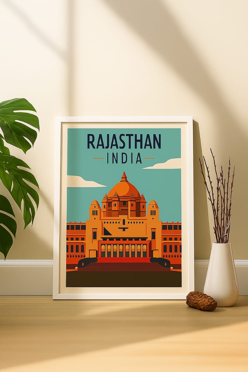 Step into the royal past of Rajasthan with this vintage-style poster. Majestic palaces and sandstone cliffs bring royal vibes to any wall.